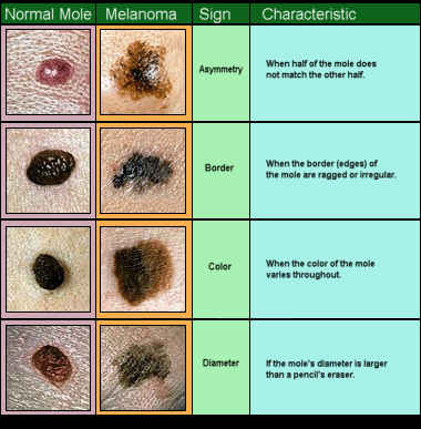 恶性黑素瘤是一种更严重的皮肤癌。它可以通过淋巴系统或血液快速传播到身体的其他部位。这种类型的皮肤癌在成年人中更常见。调查结果表明,男人最常在身体的躯干上发展黑色素瘤。虽然,女性最常在武器和腿上发展它(6.,pp 2-3)。黑色素瘤的警告迹象是:摩尔的颜色,尺寸或形状的变化,从摩尔中出血或渗出,或者是硬,块状,肿胀的摩尔,并且柔软地触摸,或感到痒。新痣也可以是黑素瘤的指标。简单的“ABCD”规则概述了黑色素瘤的警告迹象。“a”是不对称。鼹鼠的一半不匹配另一个。 “B” is for border irregularity. The edges are ragged, notched, or blurred. “C” is for color. The pigmentation is not uniform. “D” is for a diameter of greater than 6mm. Any progressive increase in size should be of particular concern (8., p 1).