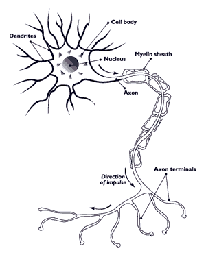 >轴突-将细胞体脉冲从细胞体朝向其他神经元或效应器;覆盖着一种叫做髓鞘的脂肪蛋白的闪闪发光的白色涂层
